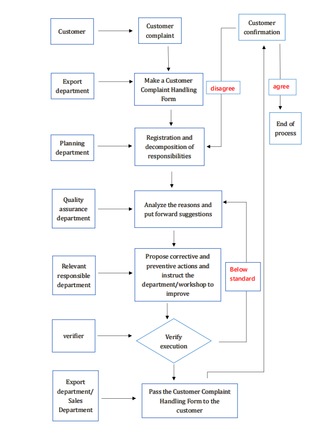 The verification personnel check the implementation status and feedback the information to the planning department, and the planning department passes the original “Customer Complaint Handling Form” to the import and export department and sales department. The export department and sales department will feedback the processing results to customers.
